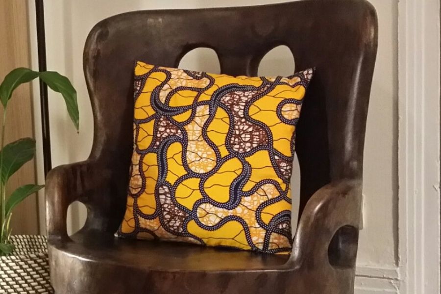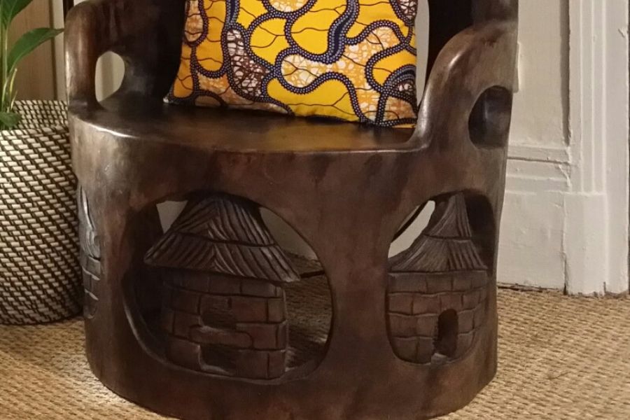 Fauteuil sculpté à la main en bois d’iroko.